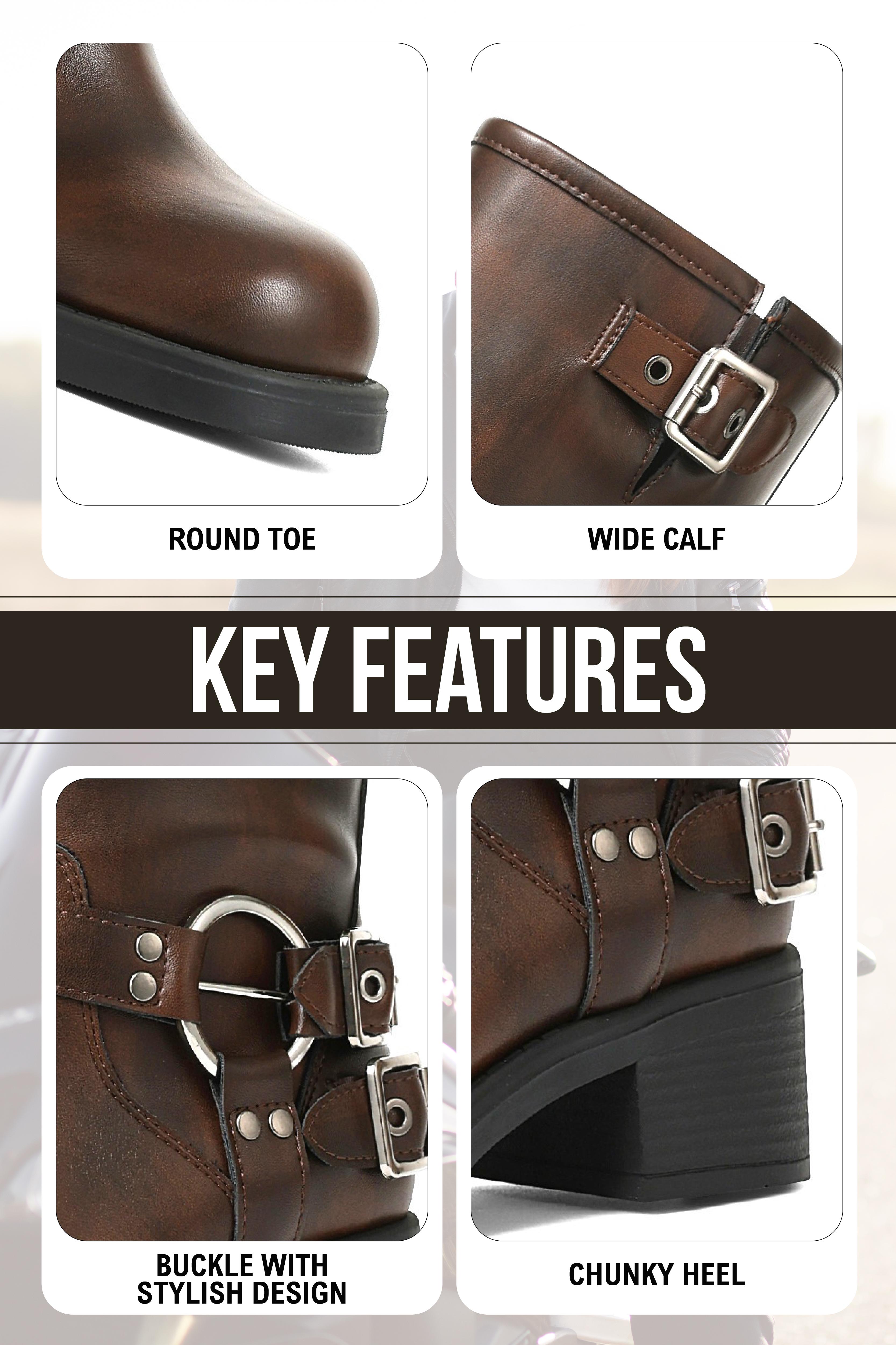 These riding boots feature a chic zipper design, stylish buckles, and a chunky block heel for a trendy look.